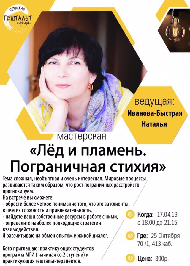 Уважаемые! В рамках проекта Гештальт-среда приглашаю вас на мой мастер-класс «Лёд и пламень. Пограничная стихия» по работе с пограничными клиентами.