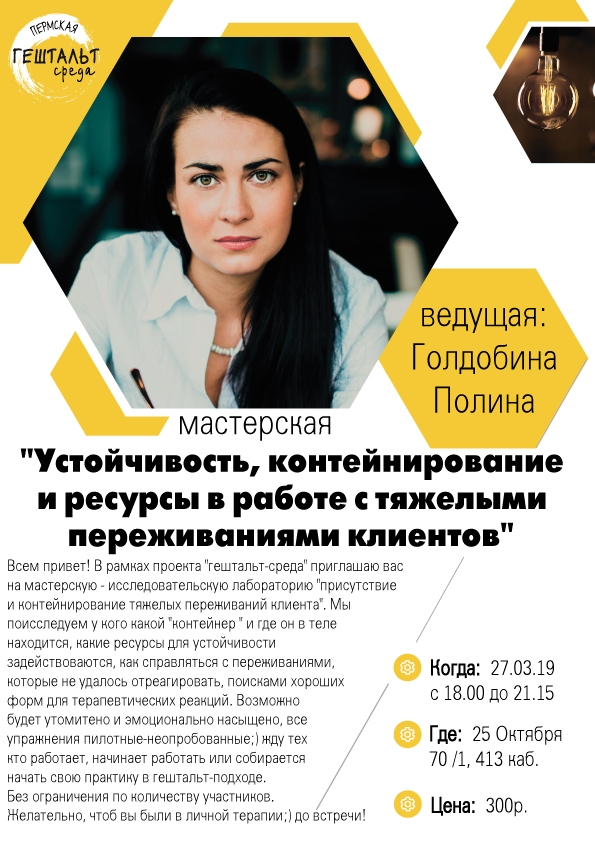 Всем привет! В рамках проекта “гештальт-среда” приглашаю вас на мастерскую – исследовательскую лабораторию “присутствие и контейнирование тяжелых переживаний клиента”. Мы поисследуем у кого какой “контейнер ” и где он в теле находится, какие ресурсы для устойчивости задействоваются, как справляться с переживаниями, которые не удалось отреагировать, поисками хороших форм для терапевтических реакций. Возможно будет утомитено и эмоционально насыщено, все упражнения пилотные-неопробованные;) жду тех кто работает, начинает работать или собирается начать свою практику в гештальт-подходе. Без ограничения по количеству участников. Желательно, чтоб вы были в личной терапии;) до встречи!