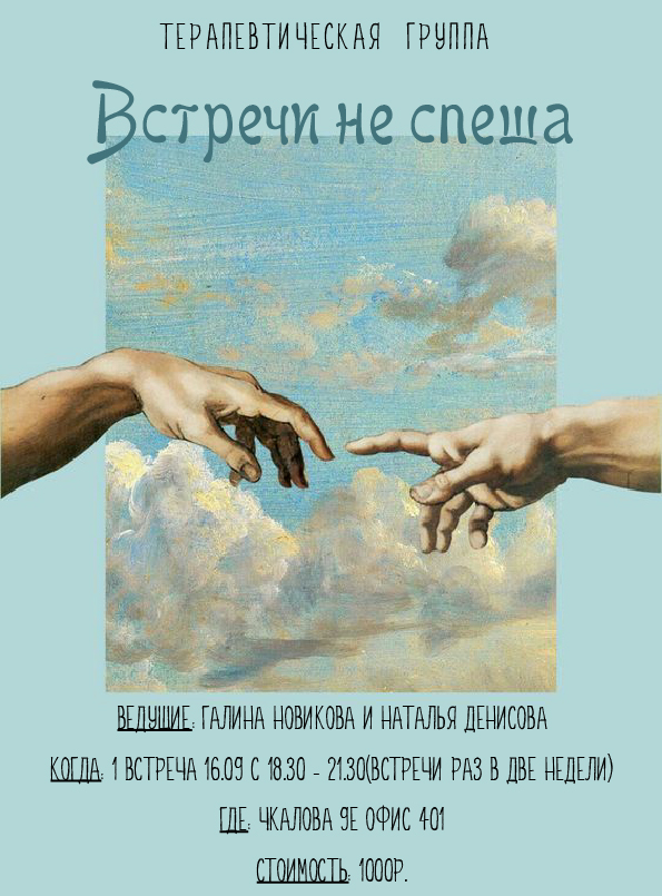 Тревога постоянный спутник нашей жизни, иногда мы игнорируем ее, иногда она превращается в огромный пугающий ком. Люди часто описывают пустоты в теле – дыры, воронки и т.д. и видят единственным вариантом эти дыры заполнять: едой, книгами, алкоголем, отношениями, вещами, работой и т.д. А порой бывает, что проскочив тревогу, оказываешься не в своей жизни и не собой «Как я здесь очутился? Как так получилось? Кто я? И т.д.» Приглашаем на терапевтическую группу «Встречи не спеша», где предлагаем замедлятся, замечать свою тревогу, обращать внимание на то как она возникает, чем она мне мешает, а чем помогает, могу ли я дышать когда мне тревожно, как я могу не проскочить и не разогнать ее, зачем мне тревога и что стоит за ней. Будем медленно, бережно и безопасно исследовать себя, приближаться к другим в своем уникальном темпе, пробовать доверять, открываться и опираться в этой тревоге, строить отношения.