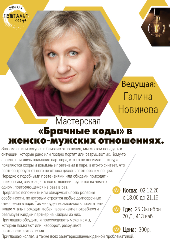 Тема: «Брачные коды» в женско-мужских отношениях. Знакомясь или вступая в близкие отношения, мы можем попадать в ситуации, которые рано или поздно портят или разрушают их. Кому-то сложно привлечь внимание партнера, кто-то не понимает – откуда появляются ссоры и взаимные претензии в паре, а кто-то считает, что партнер требует от него не относящихся к партнерским вещей. Нередко с подобными претензиями или... Читать далее »