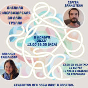 Приглашаем в он-лайн супервизорскую группу. Старт 8 ноября 2022г. 10 встреч (1 раз в 2 недели) по вторникам с 13.00 до 16.00 (мск). Студентам МГИ часы идут в зачетку. Подробнее>>