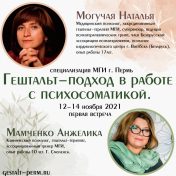 Группа началась 14 января 2022! Приглашаем студентов 2 ступени гештальт-программ и практикующих специалистов. Программа предполагает знакомство с темой психосоматики в терминах гештальт-подхода, работу с психосоматикой в клинической практике, рассмотрение симптома и болезни как части семейной системы, а так же обсуждение и разбор сложных случаев психосоматики. Подробнее>>